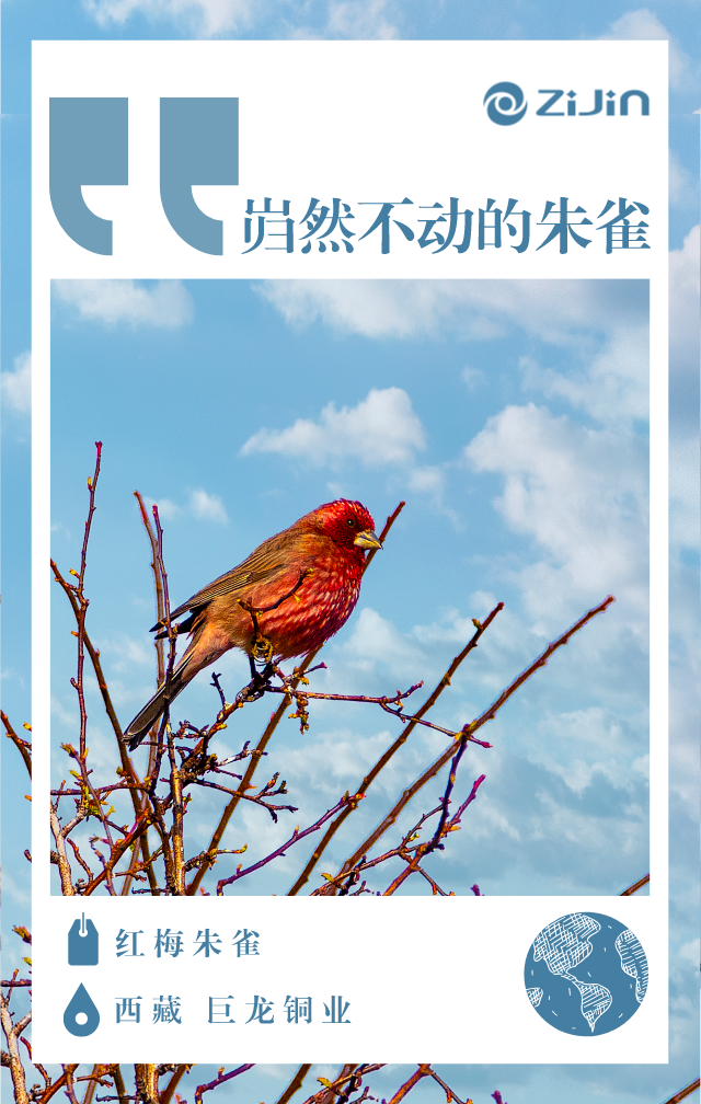 巨龍銅業(yè)員工在礦區(qū)門口偶遇覓食中的紅眉朱雀。紅眉朱雀主要棲息于海拔1500米以上山區(qū),主要吃草籽、漿果、嫩芽等植物,受驚擾時“僵”于樹叢不動直至危險消失。