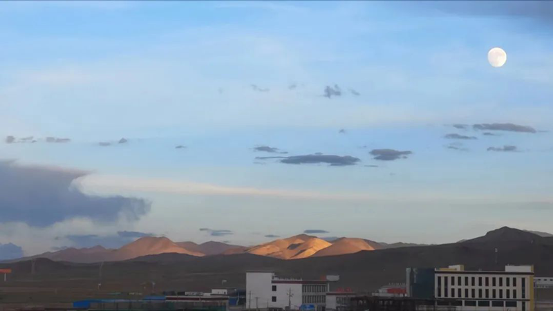 林深時見鹿,海藍時見鯨,抬頭時見你。改則縣城的落日,每天都散發出無比燦爛的光芒,將半片天空和整個城市映紅,把房屋的剪影融進沒有聲響的夜色,似乎成了它每天不知疲倦的步驟。