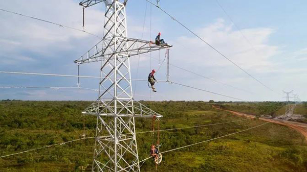 現(xiàn)場(chǎng)人員正在安裝220千伏的電力線,剛果國(guó)家電網(wǎng)將經(jīng)這條電力線向卡莫阿-卡庫(kù)拉項(xiàng)目輸送清潔、可再生的水電能源。