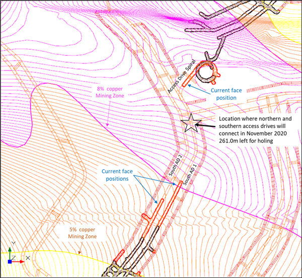 截至10月18日已完成的地下開(kāi)拓工程 (黑色),以及計(jì)劃在11月30日前進(jìn)行的開(kāi)拓工程 (綠色、棕色和紫色)。圖片還顯示了銅品位+3%、+5% 和+8%的等高線,以及南北運(yùn)輸通道計(jì)劃于11月完成連接的位置 (紅圈)。