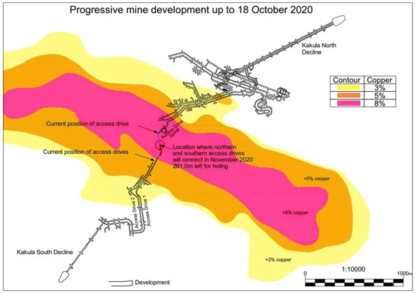 卡莫阿銅業(yè)訊 目前,卡庫(kù)拉南北兩條運(yùn)輸通道距離貫通僅剩約260米,其中北面通道已到達(dá)銅品位高達(dá)11%的區(qū)域。預(yù)計(jì)11月貫通后,即可開(kāi)采高品位銅礦及啟用專用地下通風(fēng)巷,大幅提升地下運(yùn)輸效率和安全性,有助于項(xiàng)目加快投產(chǎn)。