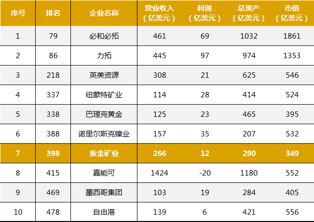 紫金礦業在上榜的有色企業中排名第7位、上榜的黃金企業中排名第3位