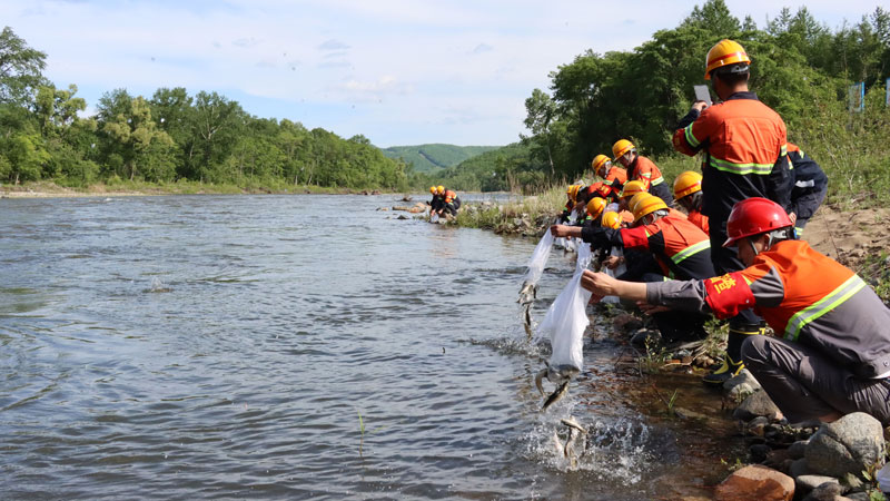 琿春曙光金銅礦開展增殖放流,在四個投放點將2000余尾柳根魚、錦鯉放入流經礦區的香房河及礦區周邊的清溝子河。