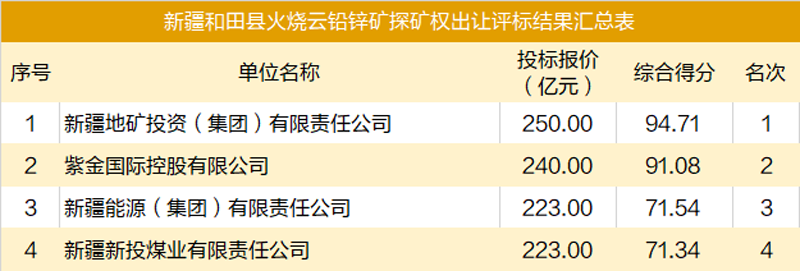本網(wǎng)訊 1月19日,新疆公共資源交易網(wǎng)發(fā)布《新疆和田縣火燒云鉛鋅礦探礦權(quán)出讓招標(biāo)結(jié)果公示》。紫金礦業(yè)全資子公司紫金國(guó)控以投標(biāo)報(bào)價(jià)240億元、綜合得分91.08分,憾居第二、未能奪標(biāo),公司對(duì)未能中標(biāo)這一全球罕見(jiàn)的世界級(jí)高品位礦床表示遺憾,對(duì)奪得首魁的新疆地礦表示祝賀。