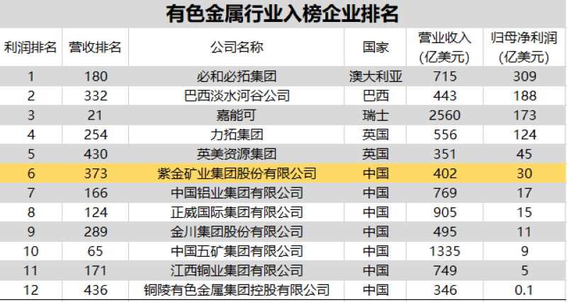 在入榜的12 家全球有色金屬礦業中,紫金礦業位居全球有色金屬礦企第6位、中國金屬礦企第1位,必和必拓、淡水河谷、嘉能可利潤分別位列全球前三。