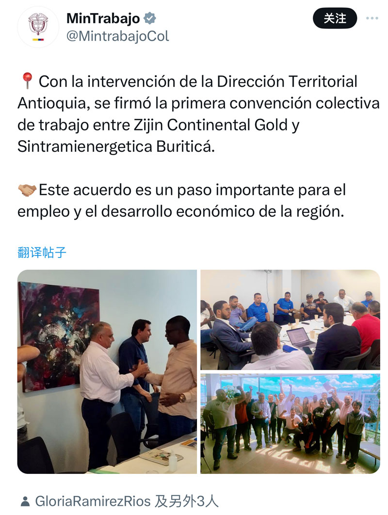哥倫比亞勞工部兩次在官方社交媒體上推文,認為大陸黃金此次工會協議的簽署,是地區就業與經濟發展的典范。