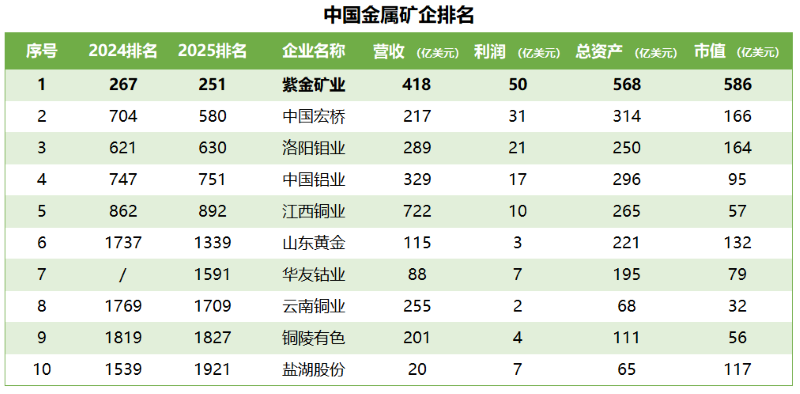 上榜的中國金屬礦企共10家,紫金礦業保持第1位,從單項指標看,紫金礦業營收占10家企業總和的16%,但貢獻了10家企業利潤總和的三成,市值更接近10家企業市值總和的四成。