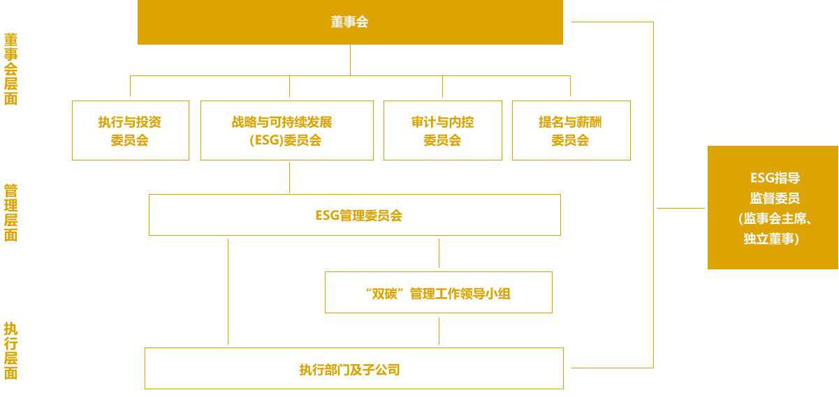 強大的管理機制是我們管理氣候相關問題的保障。我們建立了以董事會為領導的 ESG 治理體系,制定了氣候變化相關議題中期和長期發展目標,并且在 ESG 管理委員會內設立了“雙碳”管理工作領導小組,以指導推動氣候戰略制定工作以及子公司落實氣候相關目標。