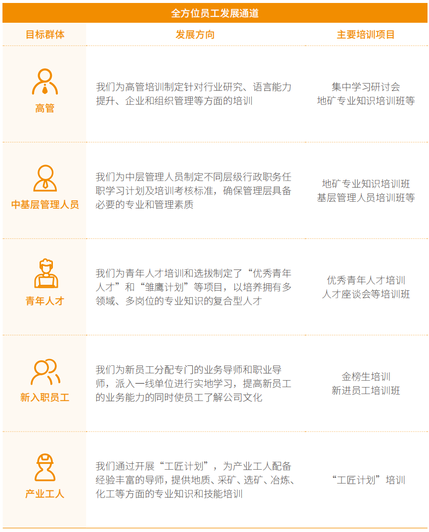 為應對國際化以及礦業人才稀缺的挑戰,我們將多元化的用工政策與公司戰略相結合,努力打造具有全球化視野、具備國際競爭力以及符合東道國利益的多元化的人才體系以及和人員結構。
