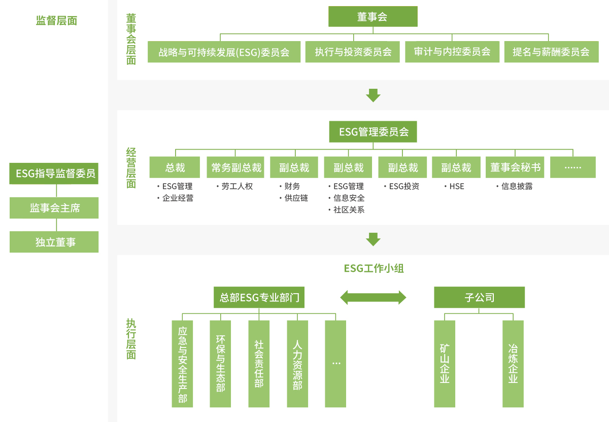 公司建有完善的ESG 治理結(jié)構(gòu),在董事會層面設(shè)四大委員會,在經(jīng)營層設(shè)立ESG 管理委員會,總部各專業(yè)部門與子公司各專業(yè)部門形成自身ESG 管理專業(yè)網(wǎng)絡(luò),依托工作小組網(wǎng)絡(luò),我們將ESG 戰(zhàn)略目標(biāo)有效分解、政策要求快速下達(dá),并形成動(dòng)態(tài)、有效的風(fēng)險(xiǎn)防控和溝通機(jī)制,落地良好的ESG 實(shí)踐。